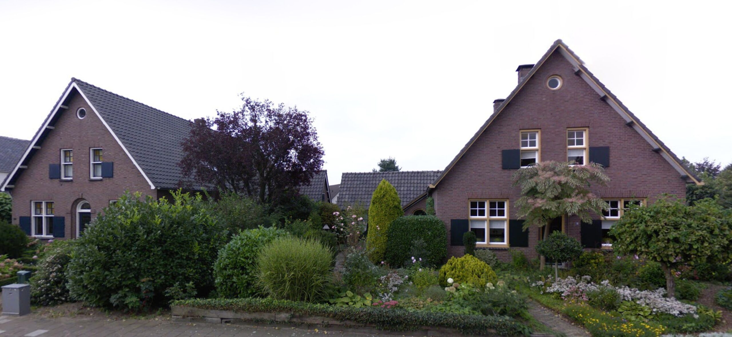 Beide woningen zijn rechthoekige bakstenen volumes met een zadeldak evenwijdig aan de straat. De gevels zijn functioneel en sober, met een eenvoudige plaatsing van ramen en voordeuren, zonder ornamentiek. Deze eenvoud benadrukt het vernaculaire karakter van de panden, waarin praktisch gebruik, duurzaamheid en menselijke schaalcentraal staan. Het zadeldak en de lage goothoogte sluiten aan bij de omliggende dorpsbebouwing en versterken de herkenbaarheid van het historische straatbeeld.